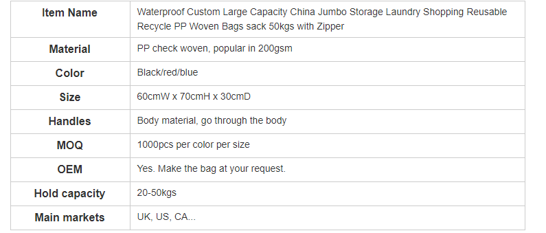 super Large Capacity Jumbo Storage Laundry Reusable Recycle PP Woven sack Bag 50kg with Zipper